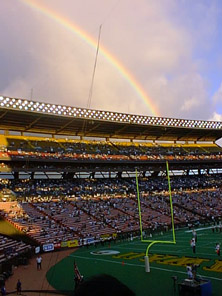 Rainbow Warriors Har du noengang sett på amerikansk fotball og prøvd å forstå reglene? Etter fire strake seirer for Universitetet i Hawaii sitt lag, var det fotballfeber i Honolulu. Vi var fem av femti tusen tilskuere da Rainbow Warriors fikk bank av et lag fra Huston, Texas.